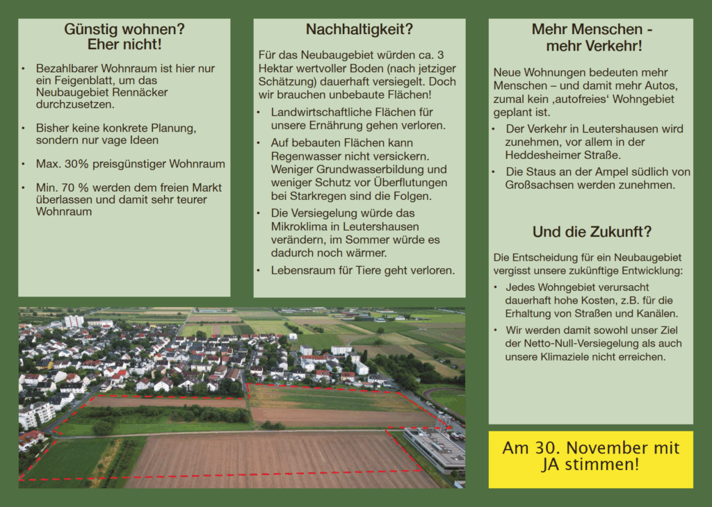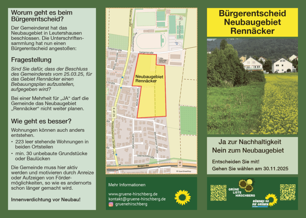 Bürgerentscheid Rennäcker: Abstimmen gehen! Unsere Wahlempfehlung: JA für eine nachhaltige Zukunft Hirschbergs – ohne das Neubaugebiet Rennäcker! Sonntag30.11.202508:00 - 18:00 UhrDownload als ics-Datei